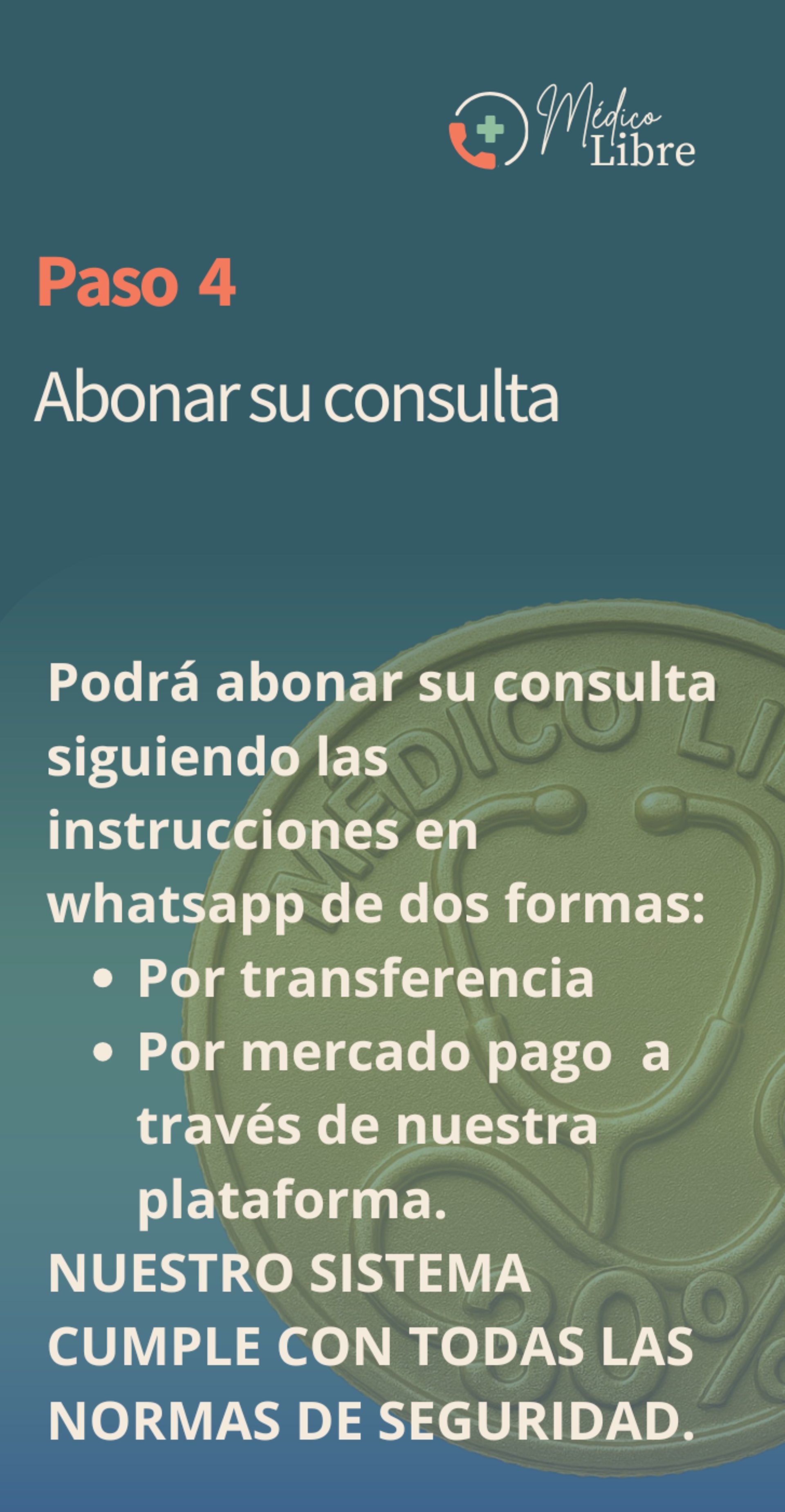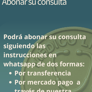 Se puede abonar al instante con todos los medios de pago a través de Mercado pago o por transferencia. El sistema lo guiará mientras realiza su consulta. En www.medicolibre.com/planes encontrará información acerca del valor de la consulta y distintas promociones.